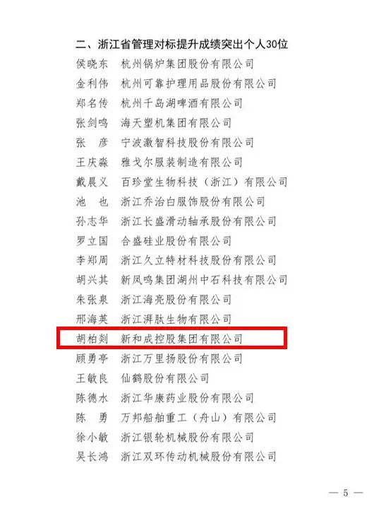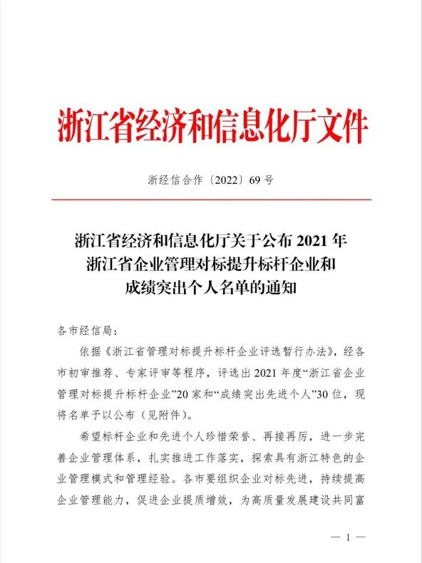 克日,,,,,,,,浙江省经济和信息化厅宣布2021年浙江省企业管理对标提升标杆企业和效果突出小我私家名单。。。。。。集团公司党委书记胡柏剡先生荣获“企业管理对标提升效果突出小我私家”称呼,,,,,,,,这不但是对胡柏剡先生在推进企业高质量生长方面做出突出孝顺的夸奖,,,,,,,,也是对win必赢国际官方网站生长效果的一定。。。。。。 助力高质量生长建设配合富足树模区和打造全球先进制造业基地是公司的庆幸使命和责任。。。。。。在“先生文化”的引领下,,,,,,,,公司始终承继开放头脑、对标学习的态度,,,,,,,,坚持面向全球市场、整合全球资源,,,,,,,,向优异学习。。。。。。公司与壳牌合作,,,,,,,,引进先进的HSE管理系统,,,,,,,,起劲实现实质清静;;;;;;在工业链上,,,,,,,,与闰土、荷兰DSM、日本东洋纺合作等企业优势互补,,,,,,,,合作共赢,,,,,,,,提升立异链、价值链,,,,,,,,聚焦聚力增强竞争力、高质量生长。。。。。。 作为一家立异型企业,,,,,,,,集团公司起劲追求管理立异之道,,,,,,,,追求管理高效率,,,,,,,,实现经济高效益。。。。。。以目的为导向、问题为导向,,,,,,,,公司每年开展管理立异课题申报、评选表扬事情,,,,,,,,并践行反思文化,,,,,,,,开展品评与自我品评,,,,,,,,引发员工立异活力,,,,,,,,解决管理中保存的主要问题和薄弱环节,,,,,,,,一直增强管理系统和管理能力现代化建设,,,,,,,,一连推动质量厘革、效率厘革、流程厘革,,,,,,,,为公司实现高质量生长、成为国际一流企业增添不竭动能。。。。。。 管理提升是企业生长的永恒主题,,,,,,,,是企业实现基业长青的主要包管。。。。。。朝着“中国win必赢国际官方网站,,,,,,,,天下win必赢国际官方网站”的愿景目的,,,,,,,,公司将坚持对标天下一流企业,,,,,,,,增强精益化管理,,,,,,,,一连优化工业结构,,,,,,,,在高质量生长中奏响配合富足的强音。。。。。。